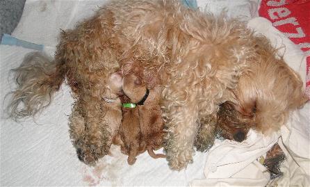 Um 16 Uhr löste sich der erste Schleim und sofort platzte die erste Fruchtblase der erste Welpe kam zum Vorschein.